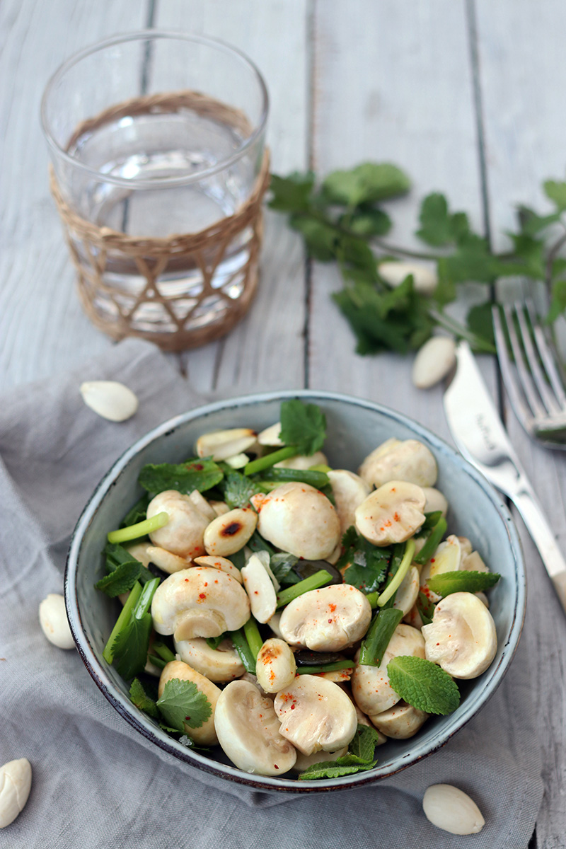 Salade de petits champignons Lou crus aux amandes et aux herbes