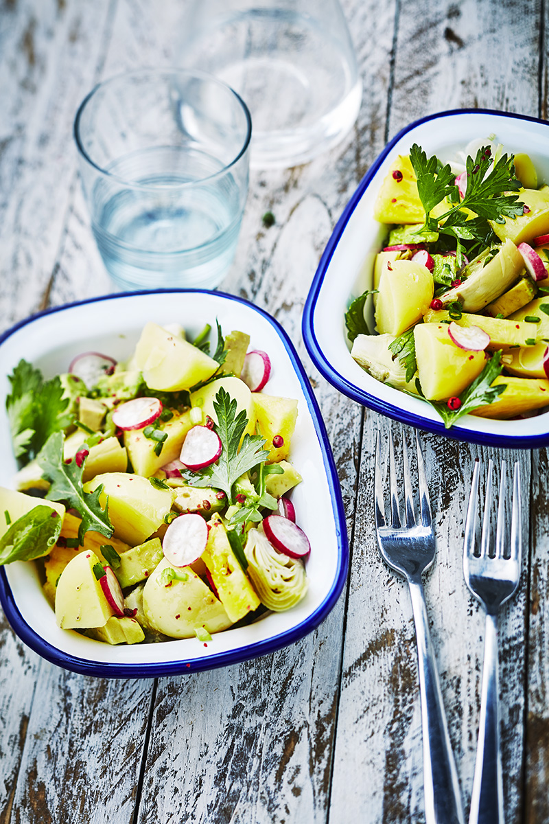 Salade de pommes de terre, avocats, cœurs d’artichaut, radis et ananas