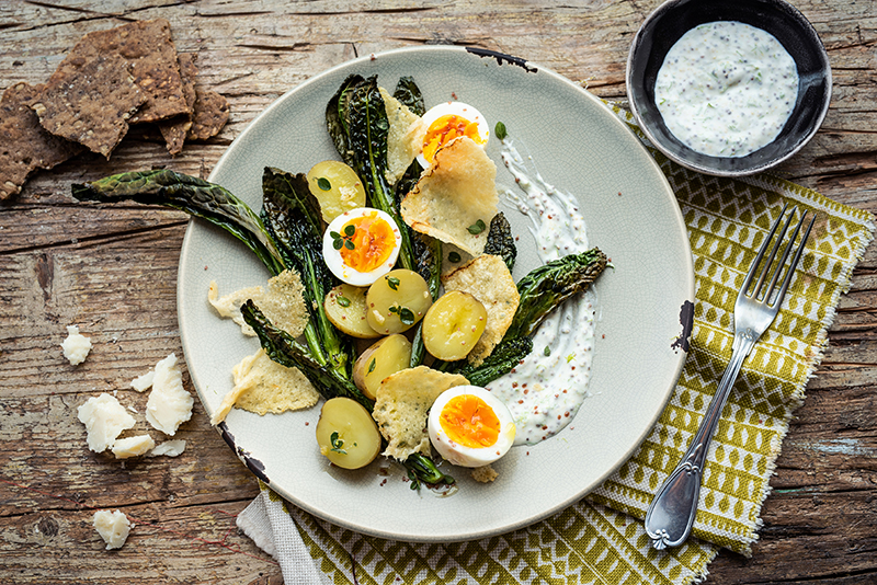 Salade de pommes de terre nouvelles, œufs durs et parmesan grillé