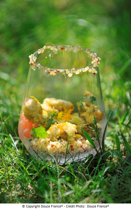 – Émincer le poulet nourri aux céréales complètes en petits cubes. Le mariner dans le jus de citron jaune avec quelques gouttes d’huile d’olive. Le poêler dans une poêle bien chaude puis le refroidir. Ajouter à l’ensemble des autres ingrédients.