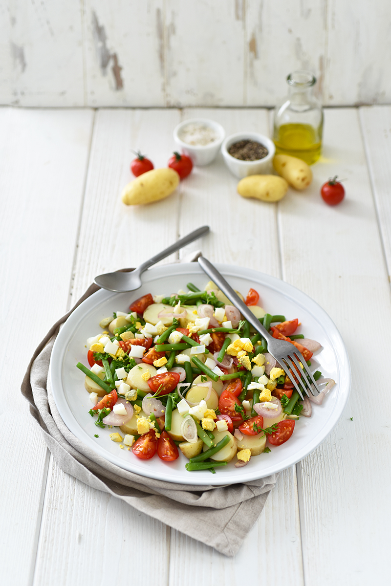 ③• MÉLANGEZ dans un saladier les haricots verts, les pommes de terre, les tomates et les échalotes.
