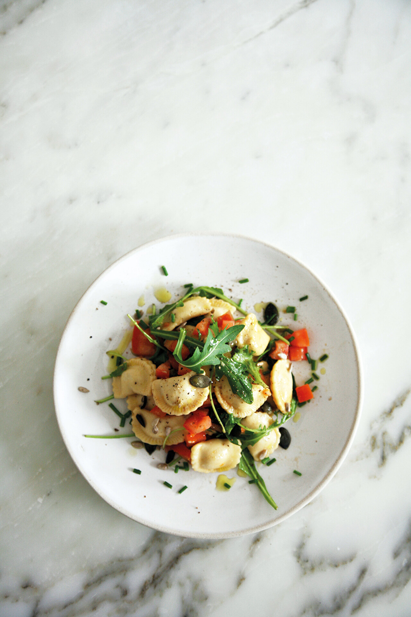 ②• Dans un saladier, mélangez les raviolis, la roquette, les dés de tomate, les câpres et les graines.
