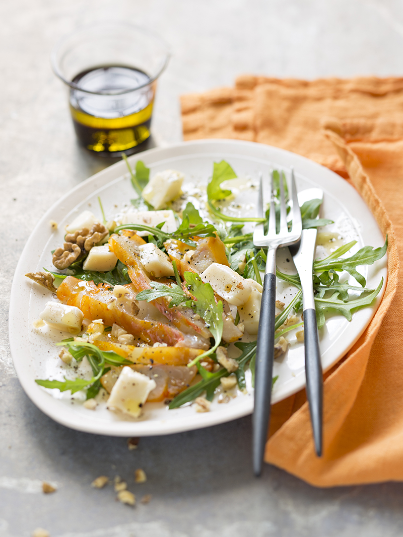 ⑤• Disposez un peu de roquette sur 4 assiettes, recouvrez avec les tranches de haddock, ajoutez quelques morceaux de Reblochon et de noix ou noisettes hachées.
