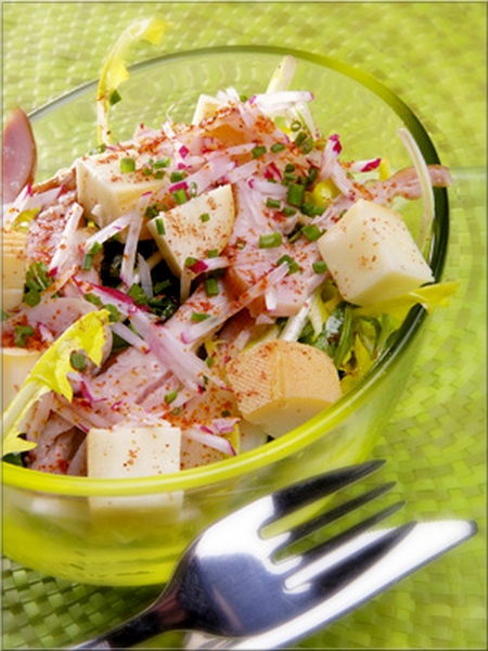 1• Cuire les blancs de poulet au four. Détailler le MERZER et les tomates en cubes de 1 cm. Couper les radis en deux ou les râper. Préparer une vinaigrette : huile d'olive, vinaigre de Xérès, sel et poivre.
