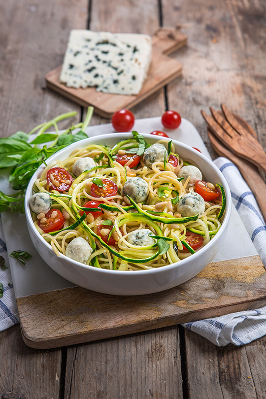Salade de spaghettis au Roquefort Société®, courgettes, pignons et tomates cerise