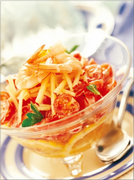Servir les Tomates de France surmontées d’allumettes de pomme, de crevettes et de feuilles de menthe.