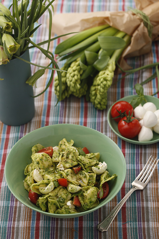Salade de Tortellini Pesto, Basilic & Pignons avec tomates cerises et mozzarella