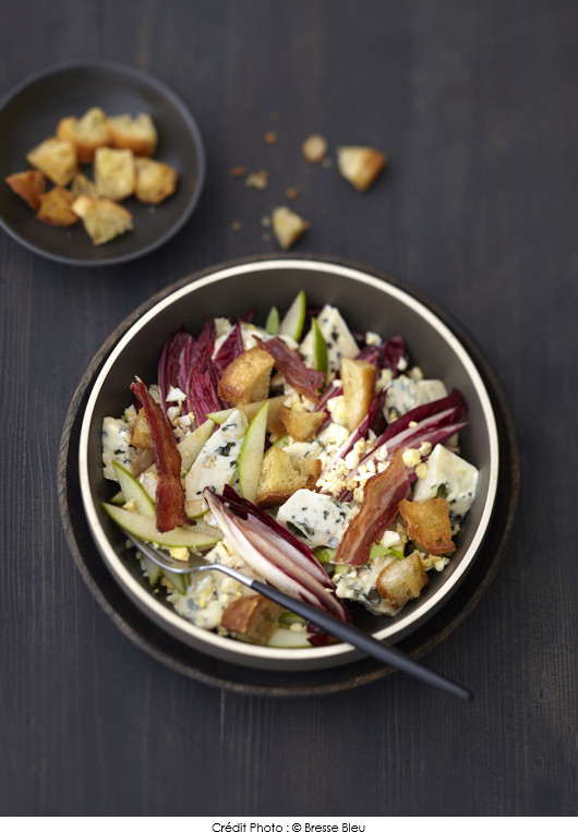 Salade d’endives rouges au Bresse Bleu, œufs durs et chips de lard