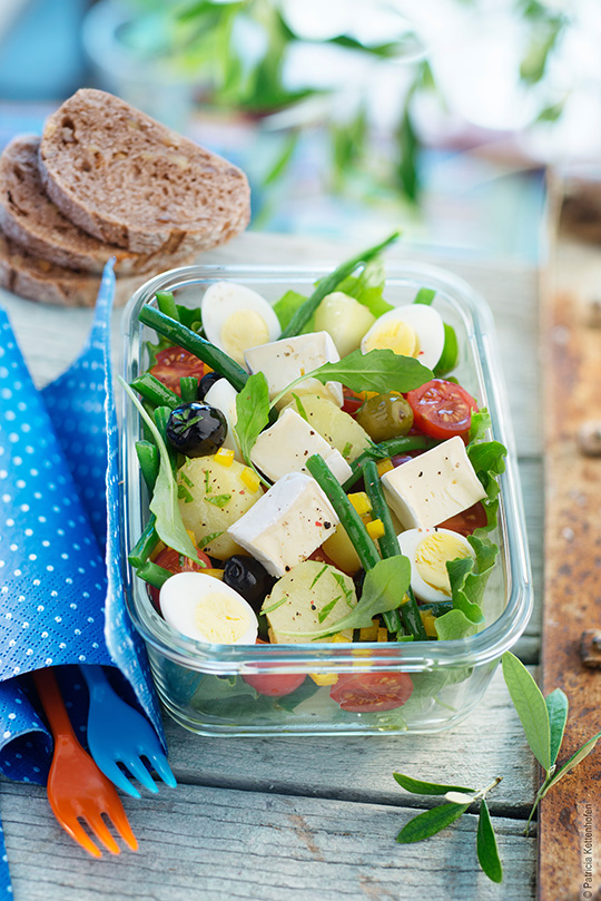 ⑦• Dans un saladier, réunir les pommes de terre en rondelles, les haricots, olives, tomates cerises et poivron. Arroser de vinaigrette, mélanger soigneusement.