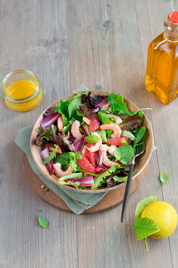 ⑤• Dans un saladier, mélangez le mesclun avec les crevettes marinées, les suprêmes de pamplemousse et les feuilles d’endives coupées.