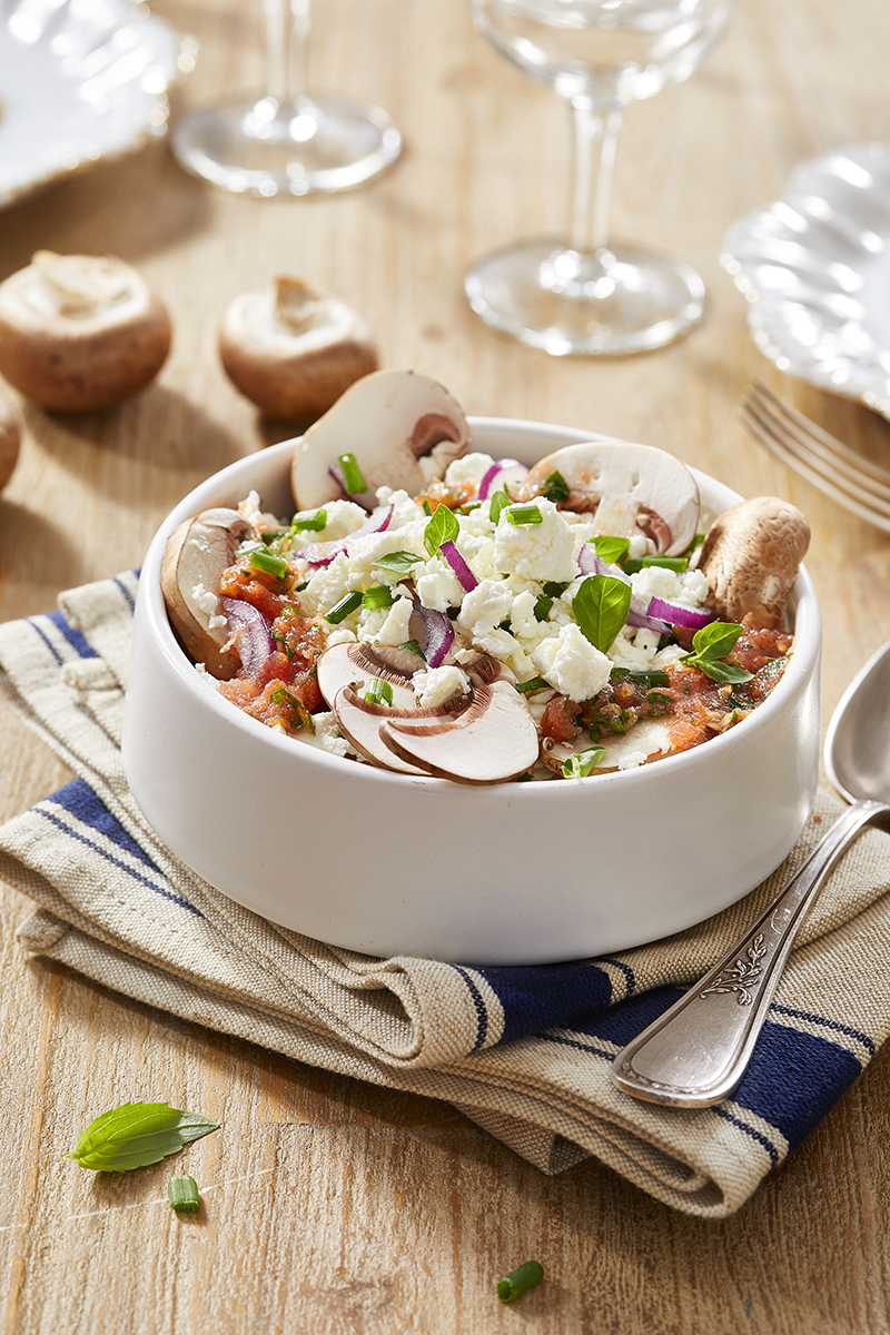 ⑤• Émiettez la feta et répartissez-la dans les 4 assiettes au dessus des champignons.