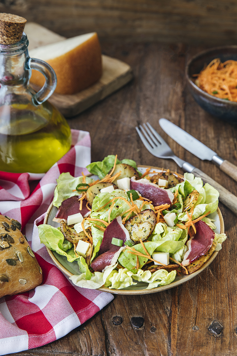 ④• Déposer un fond de laitue Florette dans chaque assiette, ajouter les pommes de terre sarladaises, les carottes râpées Florette, les tranches de magrets de canard. Parsemer de cubes d’Ossau Iraty, d’oignons nouveaux ciselés et de ciboulette Florette. Assaisonner de vinaigrette.