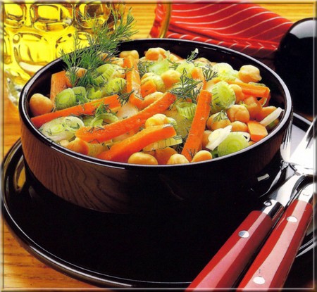 5- Mettre pois chiches, pommes de terre, carottes et oignons dans un saladier.