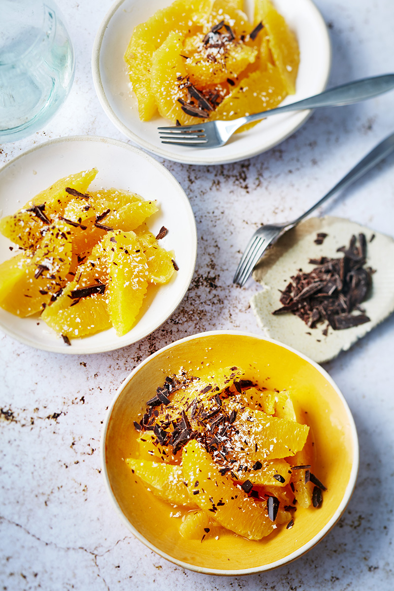 Dans un saladier, déposer les suprêmes d’orange et le jus, parsemer de noix de coco râpé et de copeaux de chocolat juste avant de déguster !