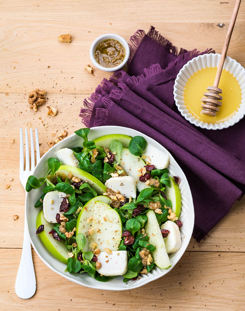 ①• Coupez la pomme en fins bâtonnets et le crottin en fines tranches.