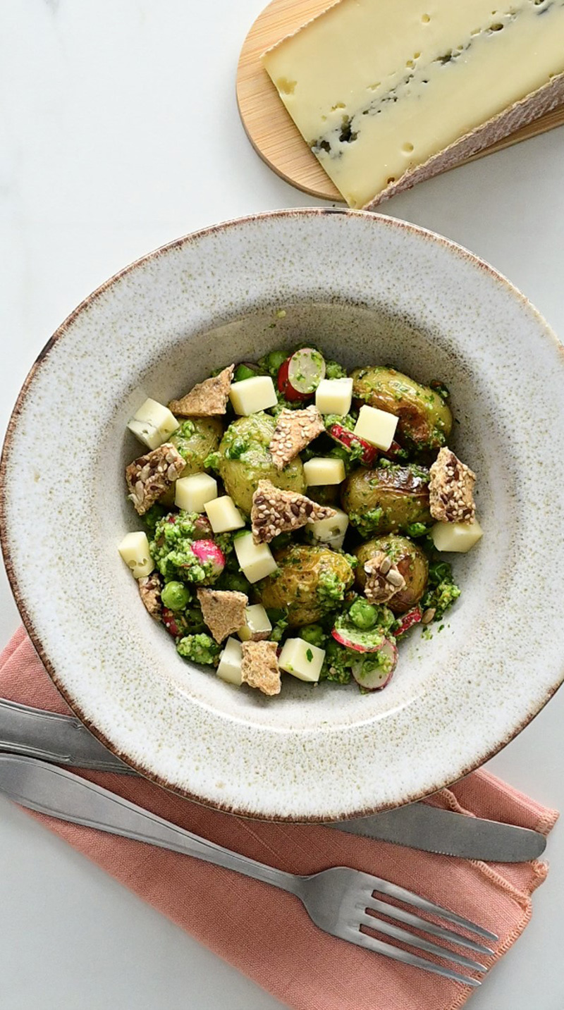 Une salade primeur alléchante avec des petits pois croquants, des radis frais et des pommes de terre tendres, le tout sublimé par la richesse du Morbier AOP. Une explosion de saveurs printanières à déguster sans modération !