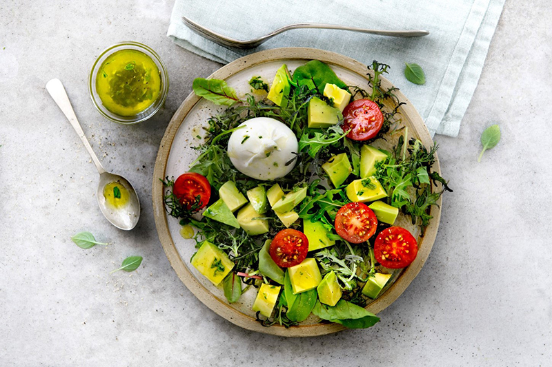 ⑤• Répartir l’avocat, les tomates et la burrata sur la salade.