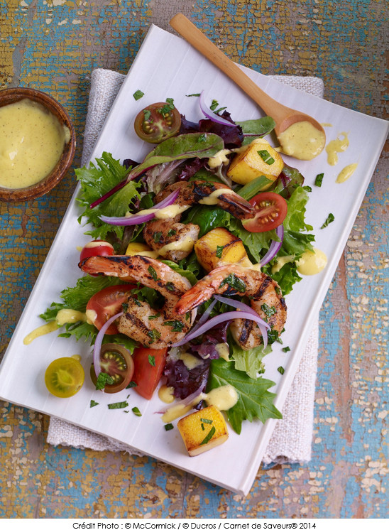 Salade tandoori, crevettes grillées et vinaigrette à la mangue