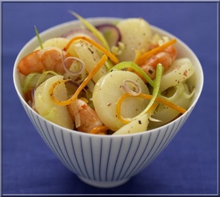 Ajoutez les crevettes, la julienne de carotte et de poireau, le gingembre et la citronnelle émincée. Versez la sauce soja et le vinaigre dans le wok puis mélangez le tout délicatement avec les pommes de terre dans le saladier.
