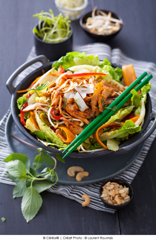 ③• Couper les sucrines en quartier, les assaisonner d’un filet d’huile d’olive. Les disposer dans un grand saladier, ajouter les légumes, les émincés Grill Végétal® CÉRÉAL, la coriandre et le basilic thaï préalablement ciselés, les graines germés et enfin la noix de coco râpée.