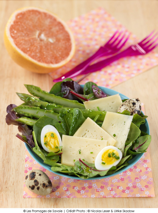L’info Nutrition de Solveig : Une salade légère, qui propose une association de légumes cuits (asperges) et crus (jeunes pousses) riches en fibres et digestes, d’œufs pour les protéines, de fruit vitaminé, de Tomme de Savoie pour le calcium, et une vinaigrette acidulée avec un bon mélange d’huile pour l’équilibre en acides gras essentiels !