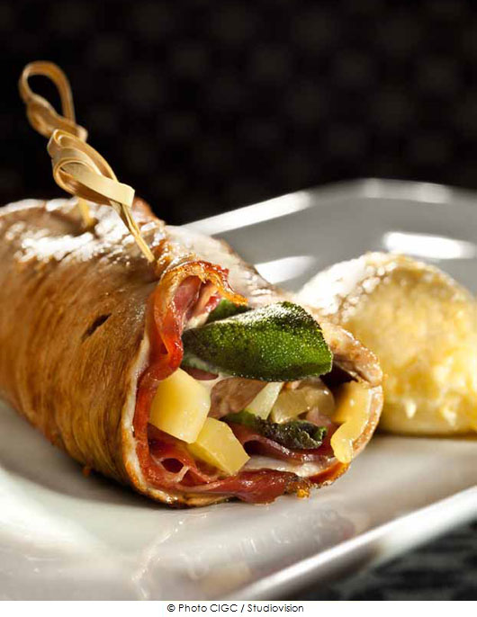 3• Faire chauffer un peu d’huile d’olive dans une poêle et cuire les saltimbocca en veillant à ce que le veau reste juteux et que le Comté soit légèrement fondant.