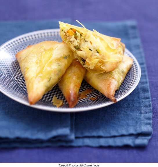 émietté. Pliez ensuite en portefeuille pour former les samosas. Soudez les bords en les badigeonnant de blanc d’œuf à l’aide d’un pinceau.