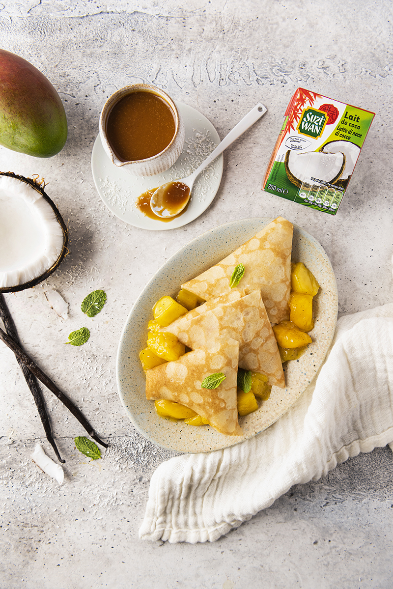 ②• Mélanger la farine, le sucre et le sel dans un grand saladier. Faire un puits au centre et y casser les œufs puis remuer. Ajouter le lait de coco Suzi Wan , l’eau et l’huile. Mélanger la préparation énergiquement jusqu’à ce que la préparation soit homogène. Dans une crêpière, préparer les crêpes jusqu’à épuisement de la pâte.
