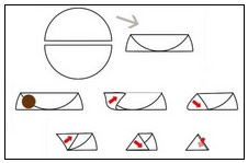 – Coupez les feuilles de brick en deux, repliez la partie arrondie, placez une cuillère de farce et pliez en triangle (voir schéma).