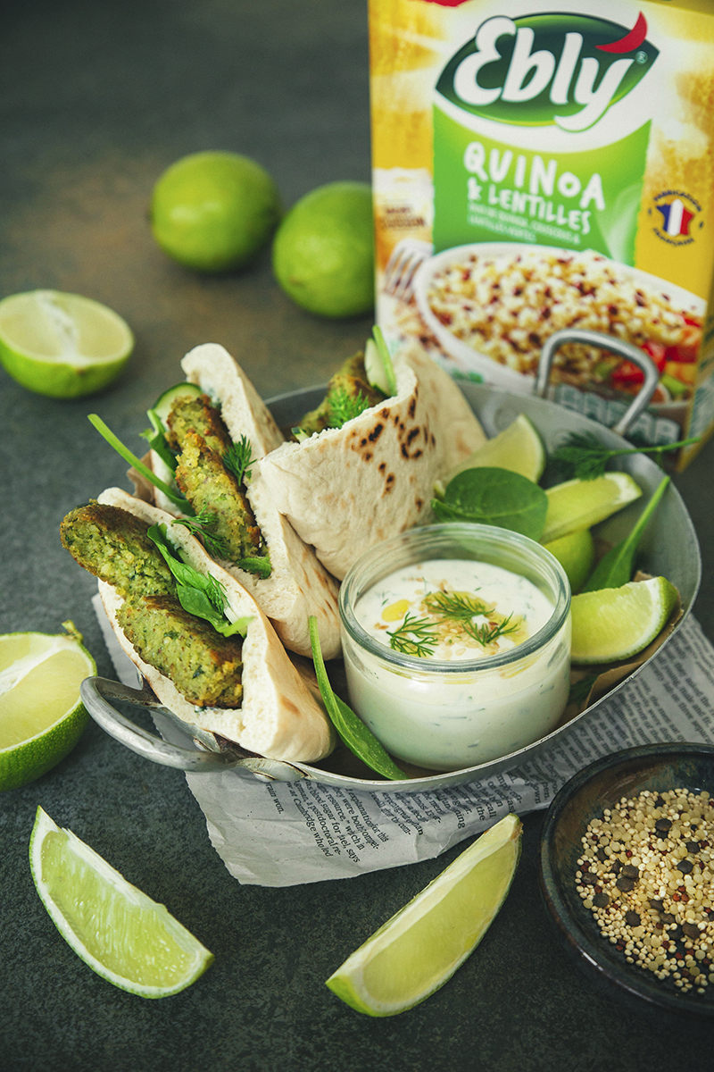 Sandwich aux falafels de quinoa et lentilles aux épinards, sauce au yaourt