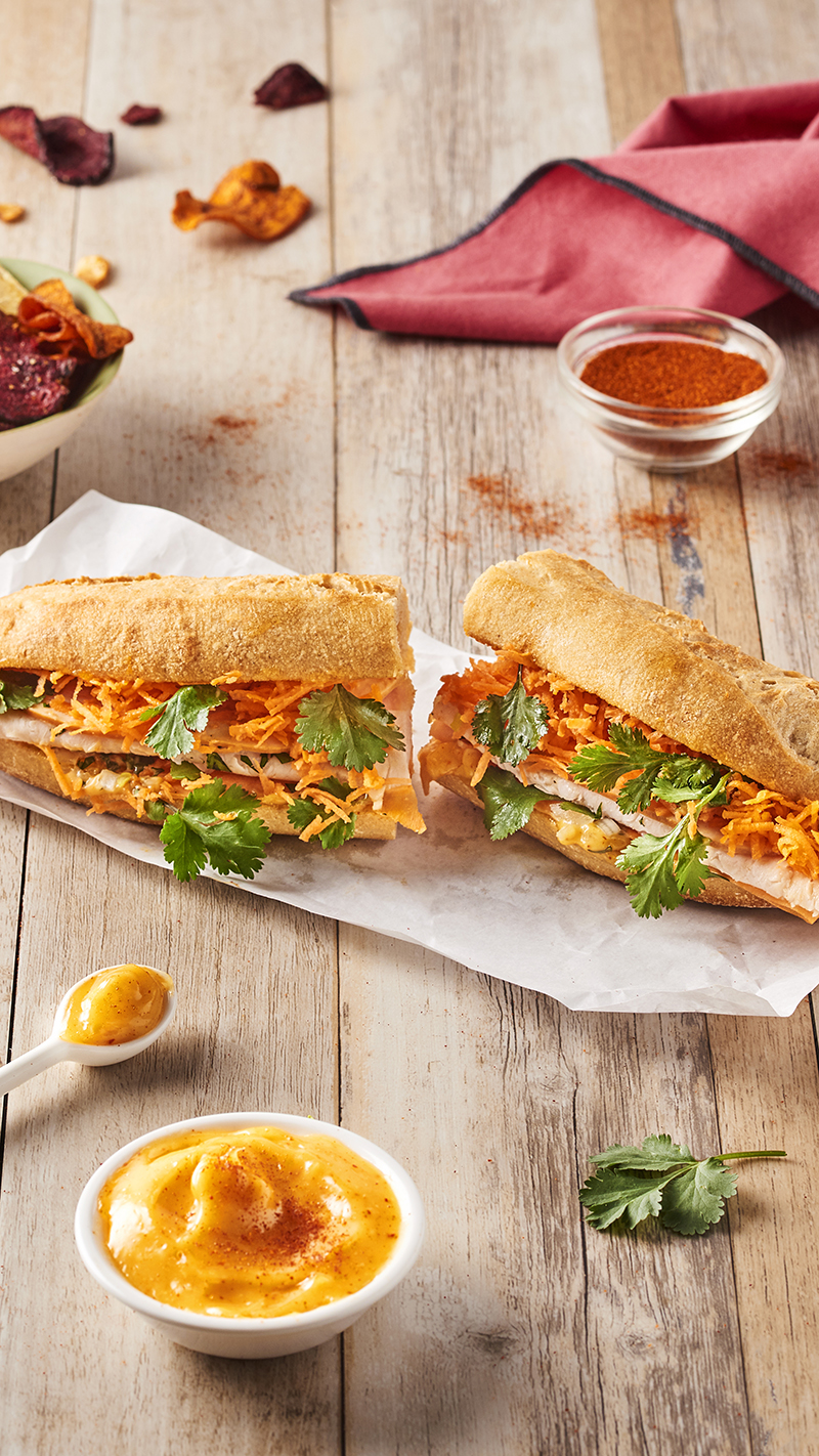 – Répartir la sauce sur un coté de chaque baguette, s’il en reste, en mettre sur l’autre côté.