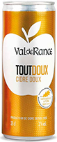 Pétillant, fruité, authentique, peu calorique et faiblement alcoolisé, découvrez toutes les facettes qui émanent des cidres Val de Rance… Tout Doux, Tout Brut, Tout Fruité… à chaque envie sa version ! Les curieux seront séduits par le Tout Doux, qui révélera un goût vif et moelleux de pommes fraîches. Les amateurs de bulles apprécieront plutôt le goût frais et léger du Val de Rance Tout Brut. Quant aux plus créatifs, ils s’aventureront vers le Tout Fruité dont les arômes 100 % naturels de framboise sont subtilement relevés en bouche par les notes acidulées du cidre blanc.