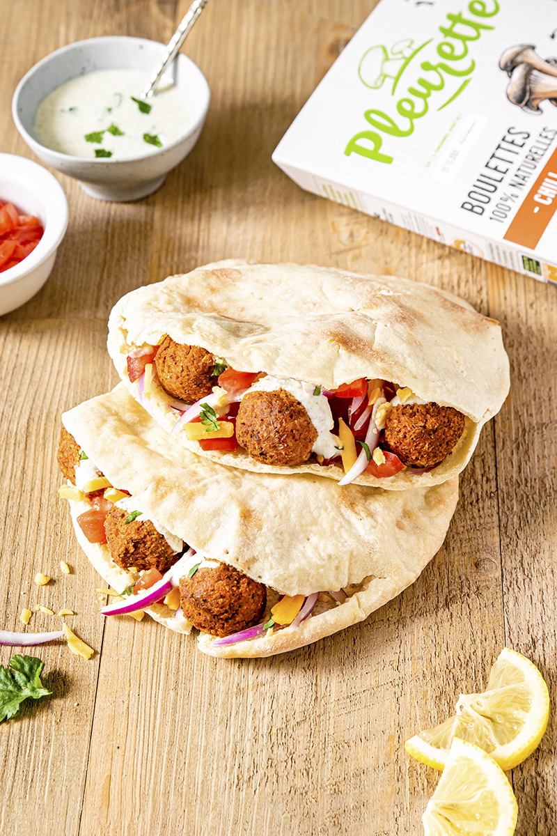 Pleurette vous propose le mariage du célèbre pain libannais, le pain pita, aux notes tex-mex avec ses boulettes chili ! Le tout accompagné d'une onctueuse sauce au yaourt relevée d'une pointe de cumin : un sandwich plein de gourmandise à découvrir !