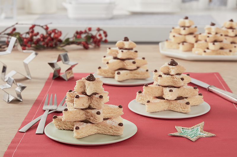 ⑦• Étalez du Nutella® sur chaque étoile et assemblez 4 étoiles ensemble. Répétez l’opération avec les étoiles restantes. Utilisez 30 g de Nutella® au total pour chaque sapin.