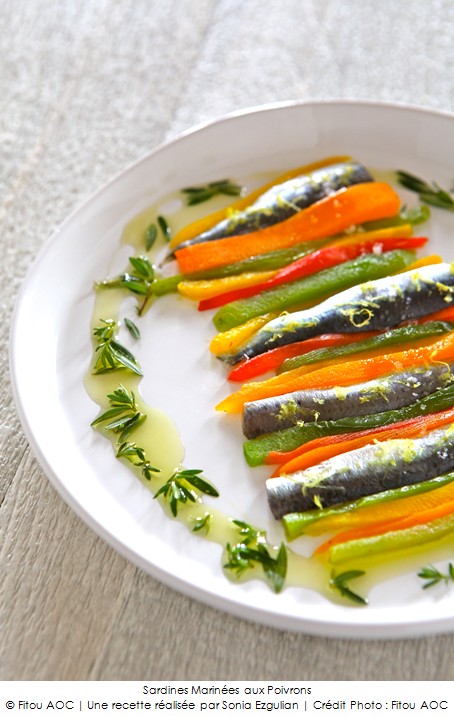 Quand les lanières de poivrons sont froides, disposez-les dans les plats avec les sardines marinées en alternant les couleurs de poivrons, parsemez de fleur de sel et de mignonnette de poivre.