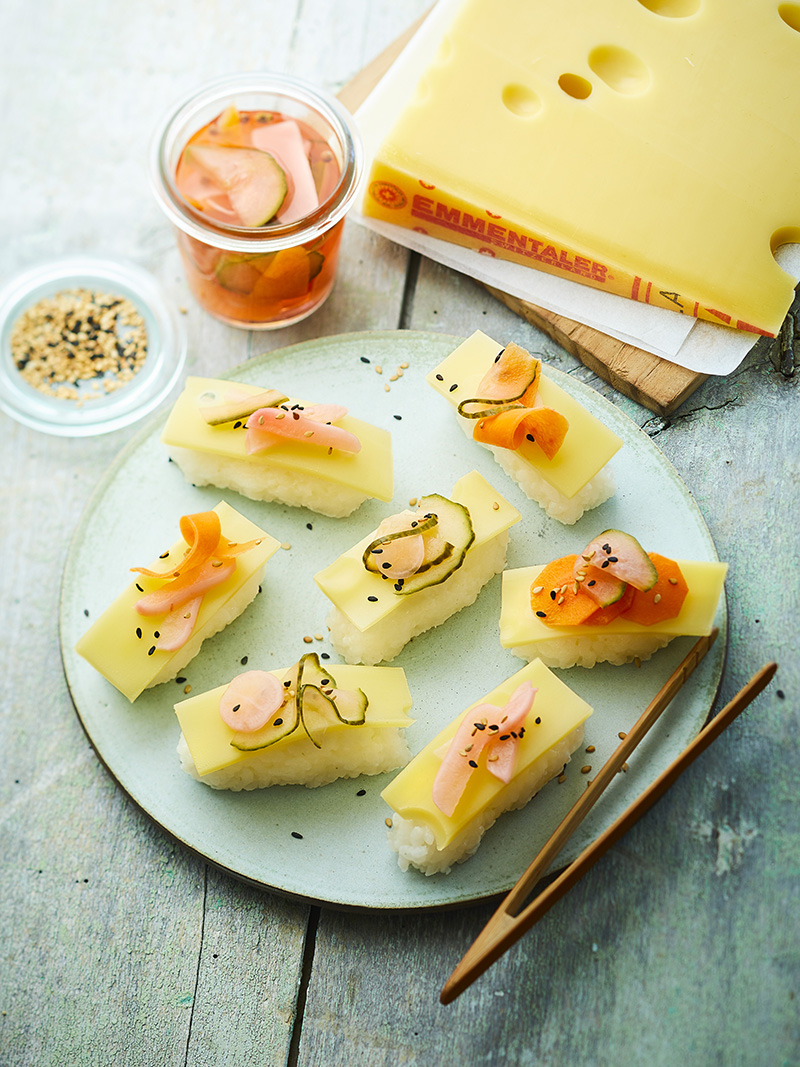 Sashimi de riz vinaigré au sésame, lamelles d’Emmentaler AOP Suisse et légumes frais en pickles