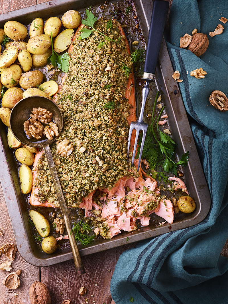 ④• Rincer le filet de saumon, le sécher et le placer sur une plaque de cuisson. Étaler la moutarde sur la chair puis répartir la préparation aux noix en appuyant pour la faire tenir. Disposer les pommes de terre autour du poisson, ajouter le beurre coupé en morceaux et le jus du citron, poivrer.