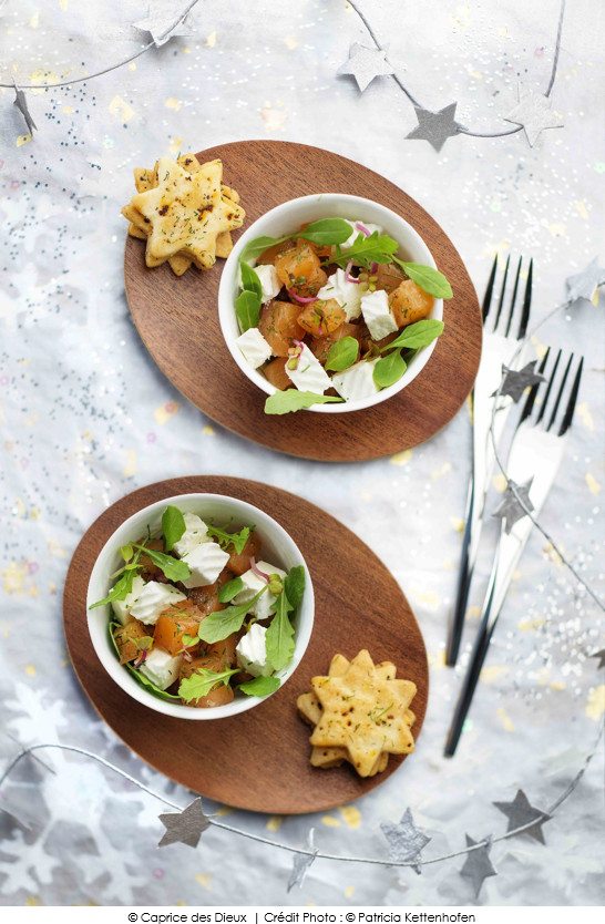 ④• Débarrasser le poisson de la préparation sucre/sel/aneth puis couper le saumon en cubes. Répartir les cubes de CAPRICE DES ANGES et les cubes de saumon gravlax dans deux petites coupelles. Disposer les pousses choisies sur le dessus.