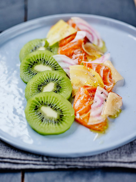 Saumon mariné aux agrumes et kiwi de l’Adour IGP façon pickles