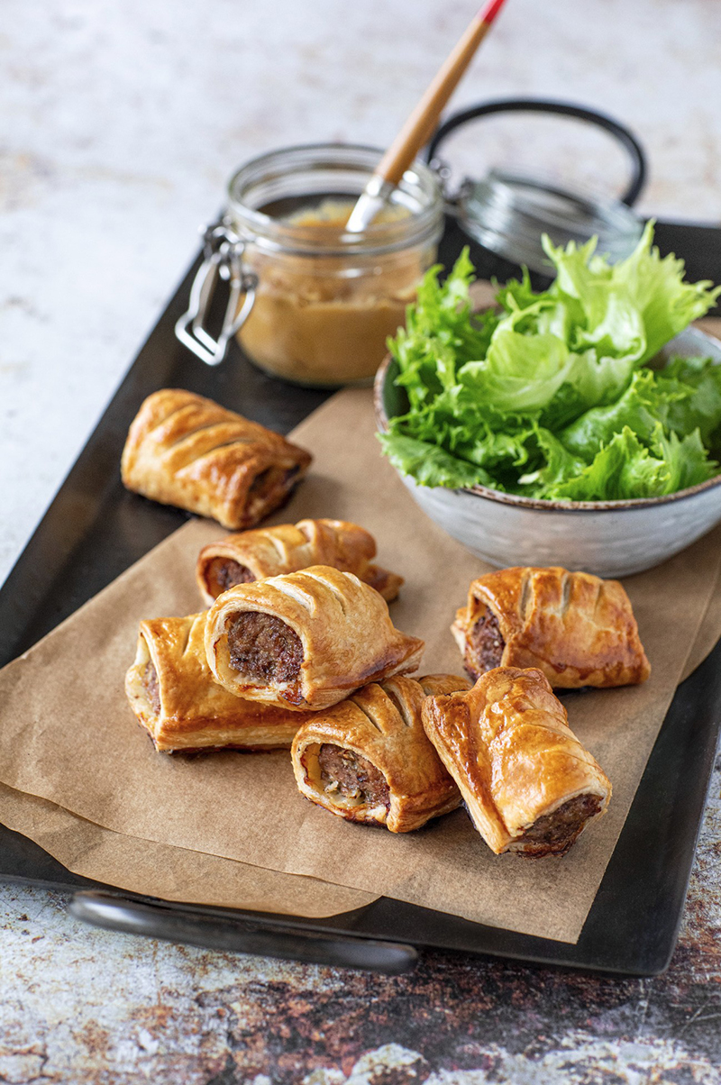Exit la traditionnelle saucisse, on opte pour une version allégée et tout aussi gourmande, avec un haché de veau aux herbes. Recette typique d’Angleterre, le « sausage » rolls est apprécié par les gourmets pour son jeu de texture entre le fondant de la farce et le croustillant bien beurré de la pâte feuilletée