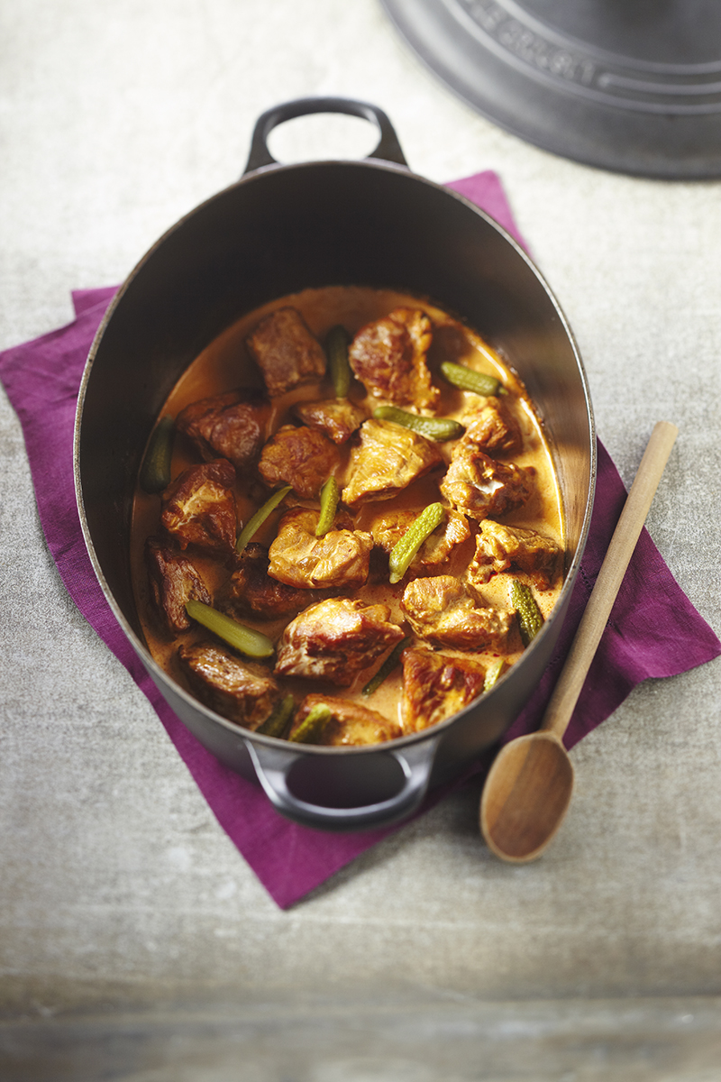①• Chauffer l’huile dans une cocotte, colorer les cubes de veau à feu vif, saupoudrer de paprika, saler et poivrer, bien mélanger, verser de l’eau à hauteur et laisser mijoter 45 minutes à feu doux et à découvert.