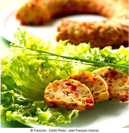 J’utilise des poivrons verts, des poivrons jaunes et ajoute des oignons que je fais revenir en même temps. J’ajoute des dès de tomates déchées, des parcelles d’ail. Je remplace le cumin par du paprika. J’ajoute du jambon, des lardons. J’utilise un moule à savarin en silicone.