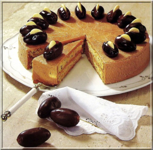 5-Couper le gâteau en deux dans le sens de l'épaisseur.Étaler une couche de crème,reconstituer le gâteau.Le recouvrir de crème à l'aide d'une spatule.Décorer des dattes garnies d'une amande.Mettre au frais 2 heures.