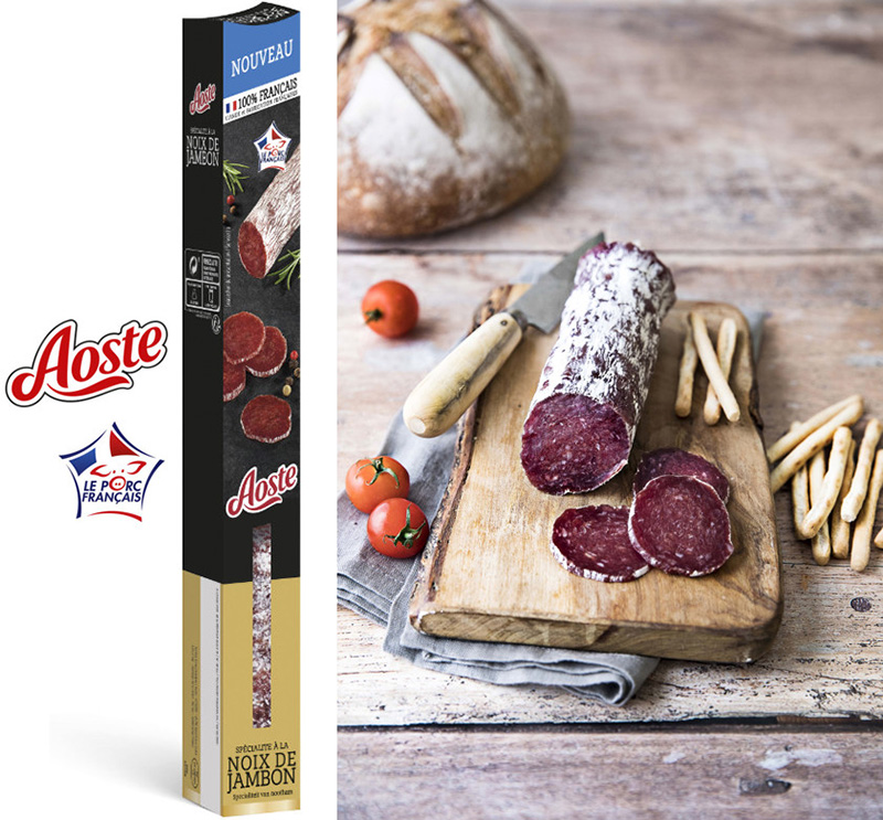 La Noix de Jambon Aoste est 100% française : la viande de porc utilisée est certifiée VPF et elle est fabriquée au cœur des Monts du Lyonnais. L’utilisation de Noix de Jambon, partie noble et goûteuse, lui donne son goût unique. Autre atout, la Spécialité de Noix de Jambon est 2,5 fois moins grasse qu’un saucisson sec classique. Elle répond aux attentes consommateurs de produits goûteux et moins gras.