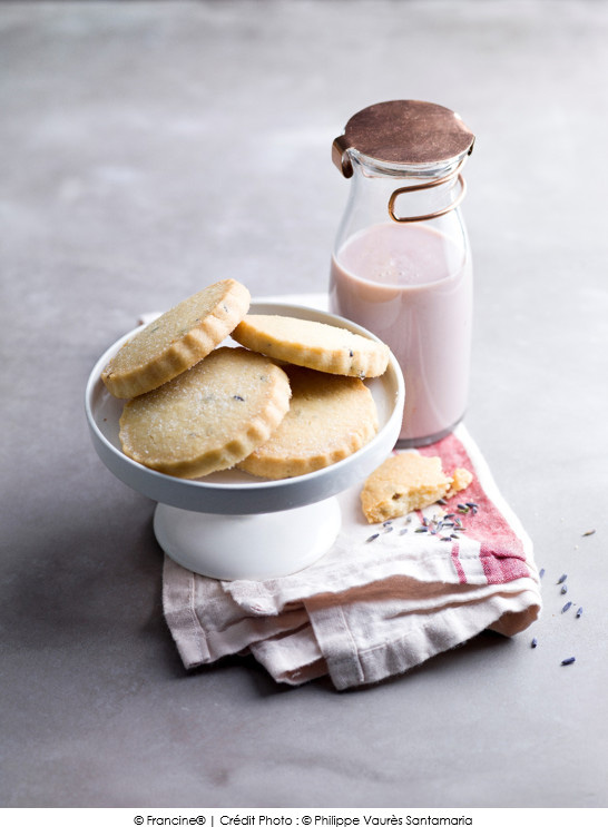①• Dans un saladier, travailler en pommade les deux beurres et le sucre. Puis ajouter le miel, les fleurs de lavande et la farine et mélanger à la main pour obtenir une boule lisse et homogène. Disposer le pâton sur une plaque entre deux feuilles de papier sulfurisé et l’étaler au rouleau à pâtisserie sur 1 cm d’épaisseur. Réfrigérer pendant 1h