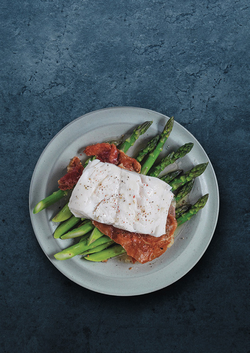 ⑦• Servez le Skrei avec les asperges, accompagné du jambon cru et de pommes de terre à l’eau.