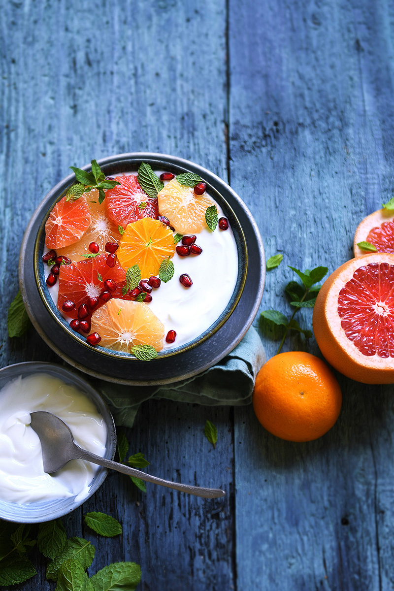 ④• Remplir les bols de Skyr, puis placer les suprêmes d’agrumes de jolie façon. Terminer avec les grains de grenade et la menthe.