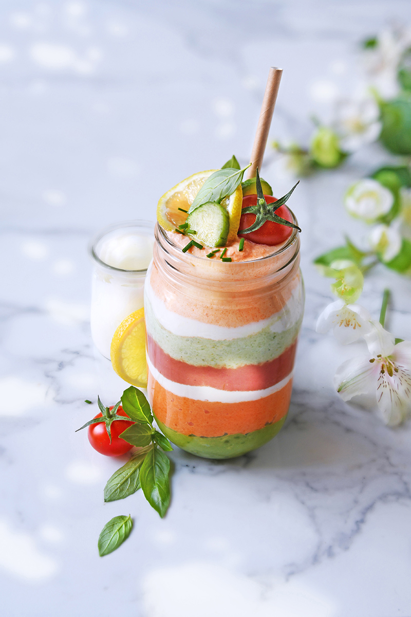 ②• Goûter chaque préparation pour ajuster l’assaisonnement. Répartir les préparations les unes au-dessus des autres dans les bocaux. Décorer avec des morceaux de légumes et quelques herbes.