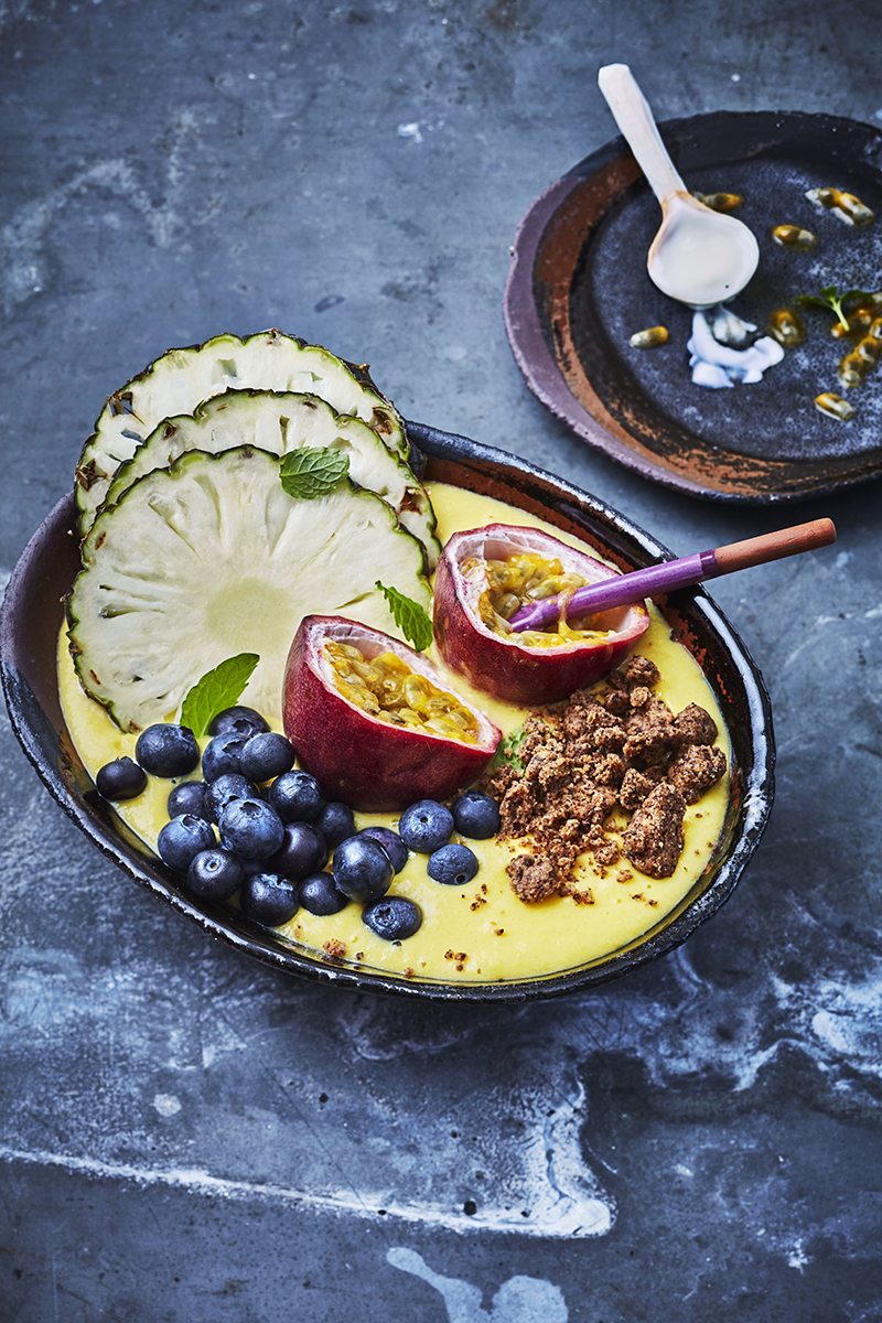 ⑤• Versez le smoothie dans un bol, déposez des tranches d'ananas, un fruit de la passion, du crumble au chocolat et quelques myrtilles fraîches.