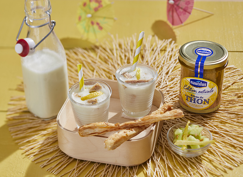 Smoothie de concombre et émietté de thon au citron Nautilus et gressin maison